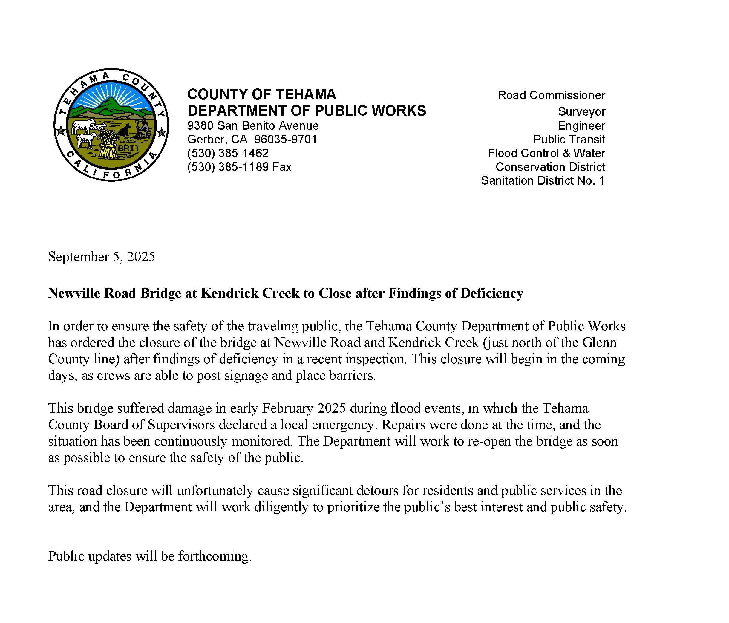 The Newville Rd. over Kendrick Creek bridge remains closed in the interest of public safety per an order by Caltrans. We are working diligently to seek a solution to mitigate the issues.